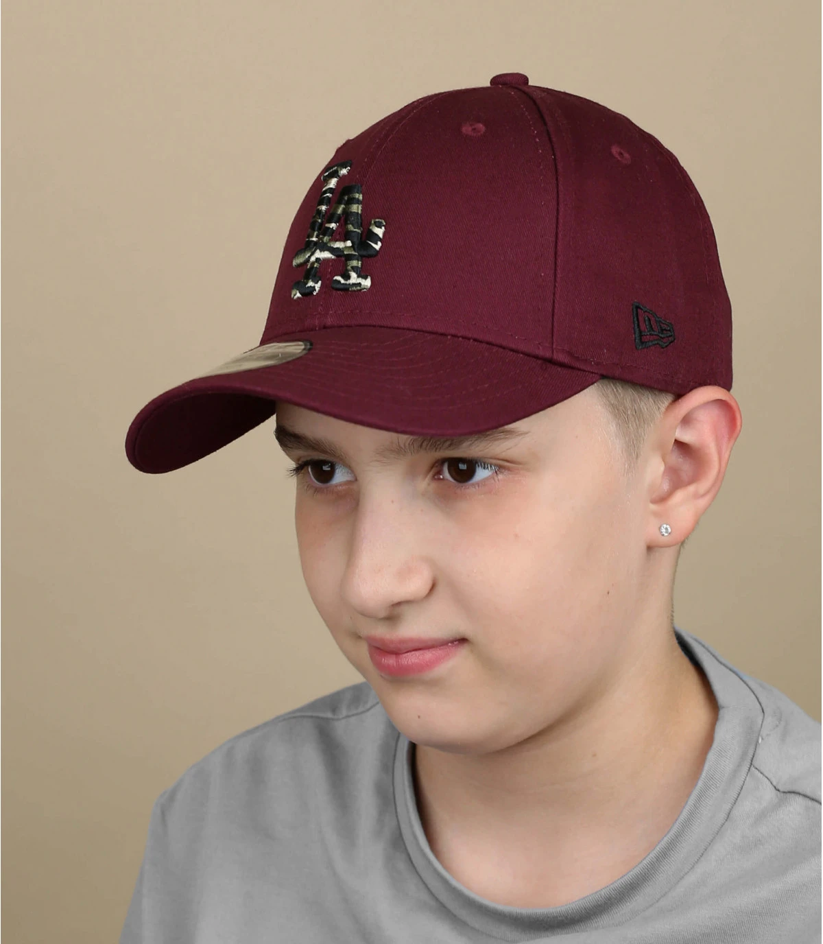 La sĂ©rie Wild Camo de New Era prĂ©sente des logos en 3D Ă motif camo, comme sur ce modèle enfant de couleur bordeaux, brodĂ© des initiales LA sur l’avant.
